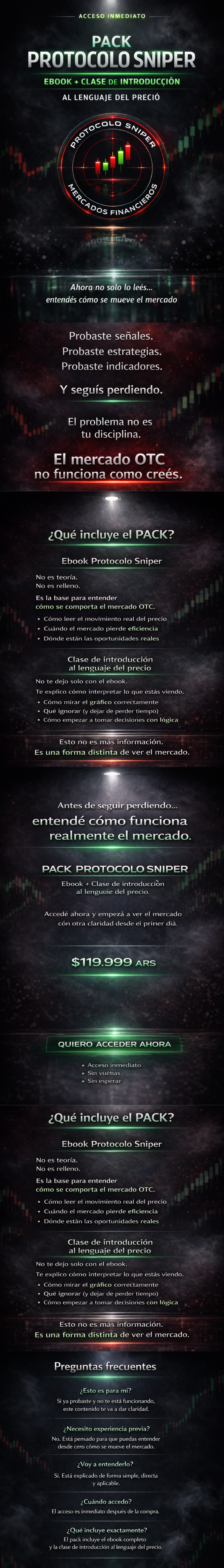 No. El Protocolo no es una estrategia tradicional. No se basa en indicadores. Es un enfoque estructurado para entender cómo se comporta el OTC y cuándo el sistema entra en condiciones donde el trader suele interpretar mal lo que ve.
